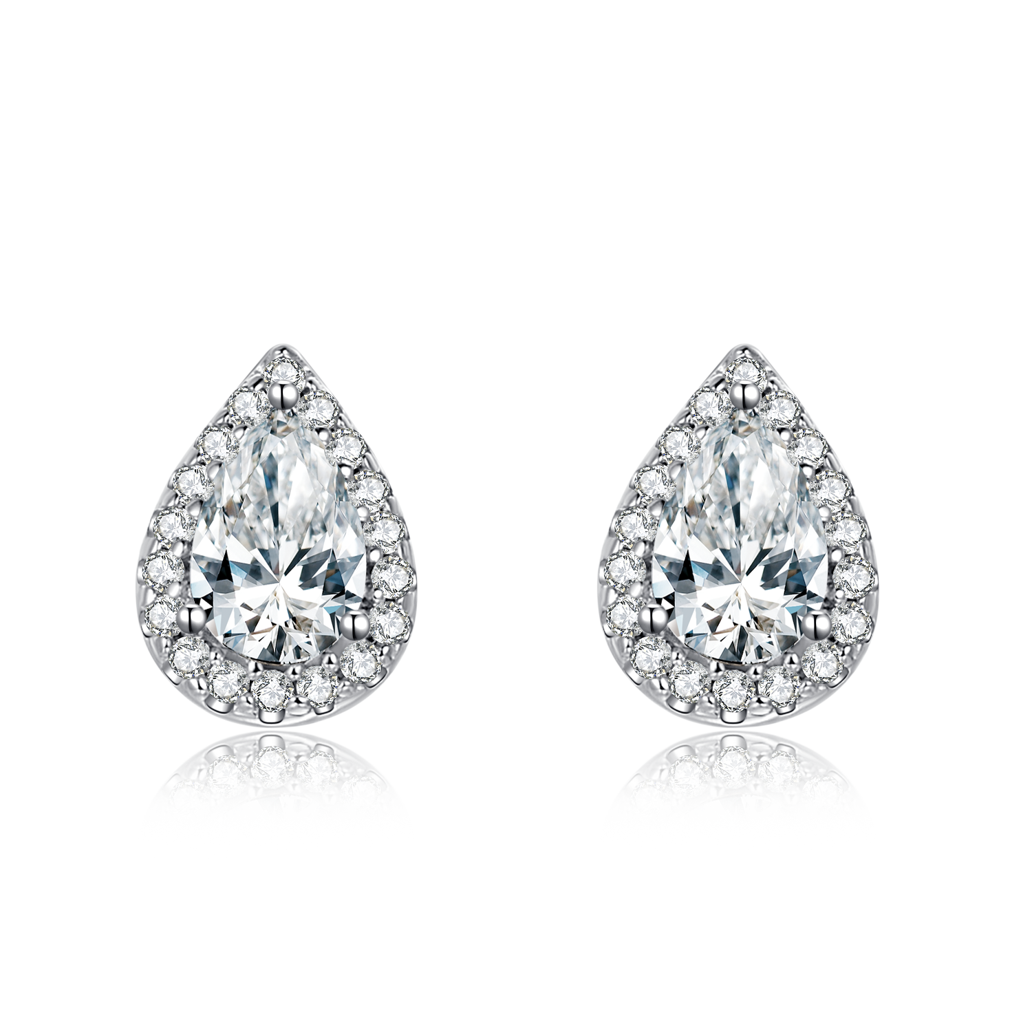 This exquisite earrings features a 0.5-carat pear drop Moissanite stone as its centerpiece. which is known for its brilliant sparkle and exceptional durability.