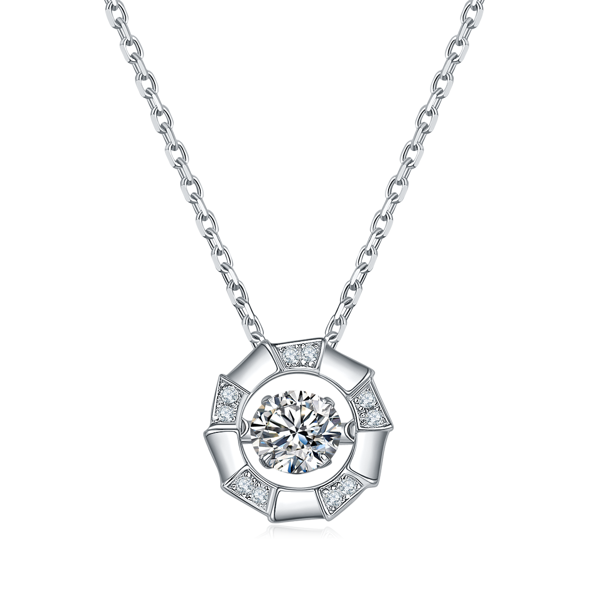 This necklace is a unique piece of jewelry designed for women.The centerpiece of the necklace is a 0.5-carat round cut Moissanite stone. surrounded by a circular snake bones with multiple small Moissanite stones.