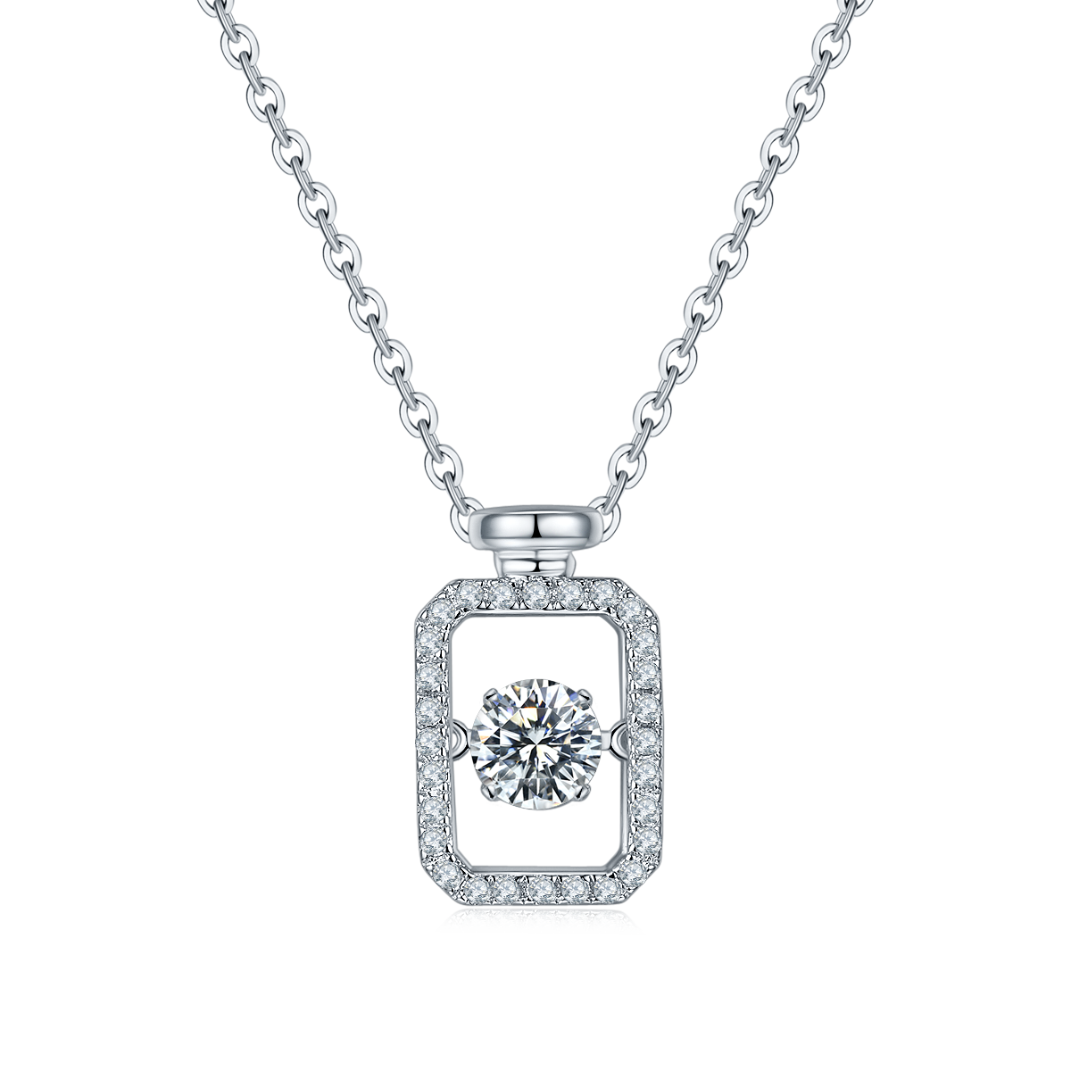 This necklace is a unique piece of jewelry designed for women.The centerpiece of the necklace is a 0.5-carat Moissanite stone. The necklace features a pendant designed as a perfume bottle. This unique design make the necklace emit the charming charm of women