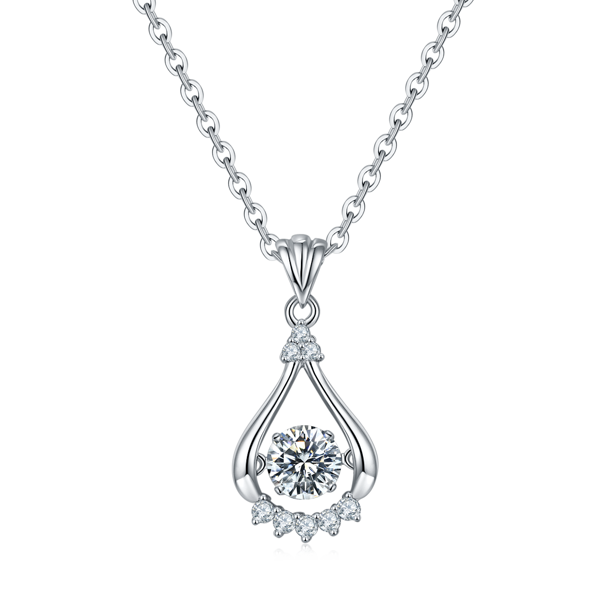 This beautiful teardrop necklace for women features a 0.5-carat round cut Moissanite stone as its centerpiece. which is securely set in a delicate yet durable setting. enhancing the stone's natural beauty. The stone is surrounded by several smaller accent stones. adding extra sparkle and elegance to the design.