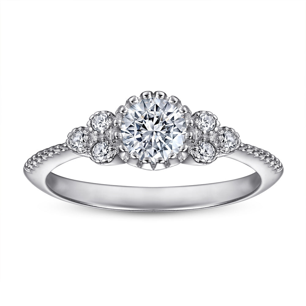 This stylish silver ring features a 0.5CT Round Zircon in center and decorated with six samll round zircon. set in sterling silver setting. Crafted with superior quality materials. this elegant ring is an ideal accessory for any occasion.
