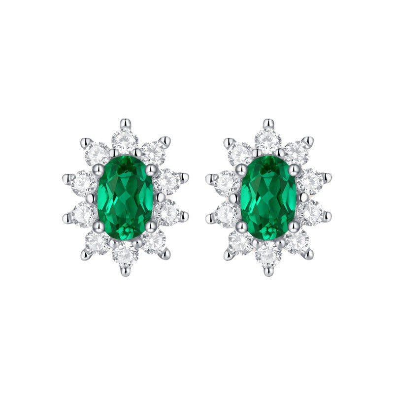 This earring is an exquisite piece of jewelry. with its main stone being a oval cut lab-created emerald surrounded by a ring of water droplet shaped zircon.