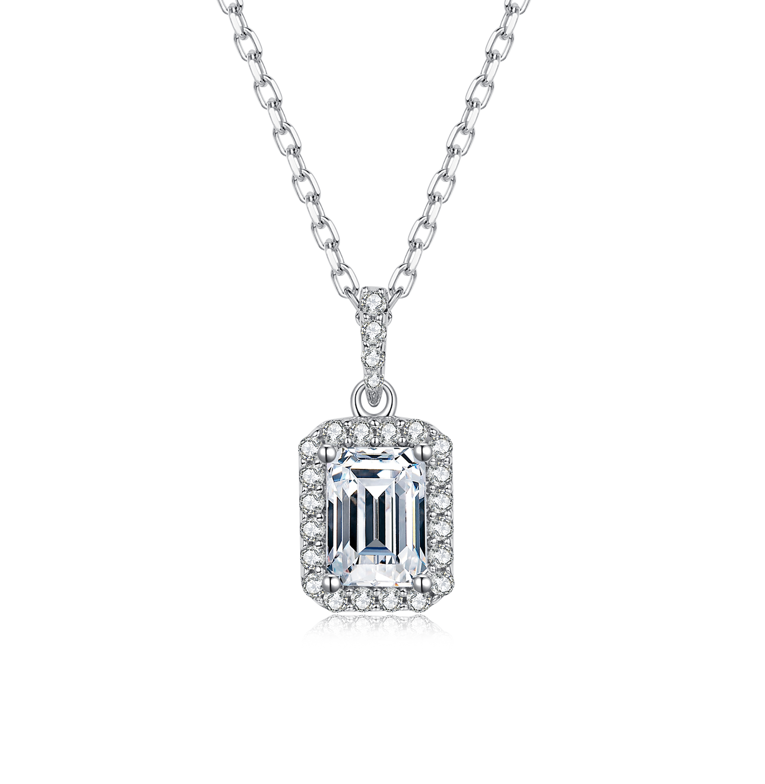 This exquisite necklace features a 1.0-carat emerald-cut Moissanite stone as its centerpiece. which is known for its brilliant sparkle and exceptional durability.