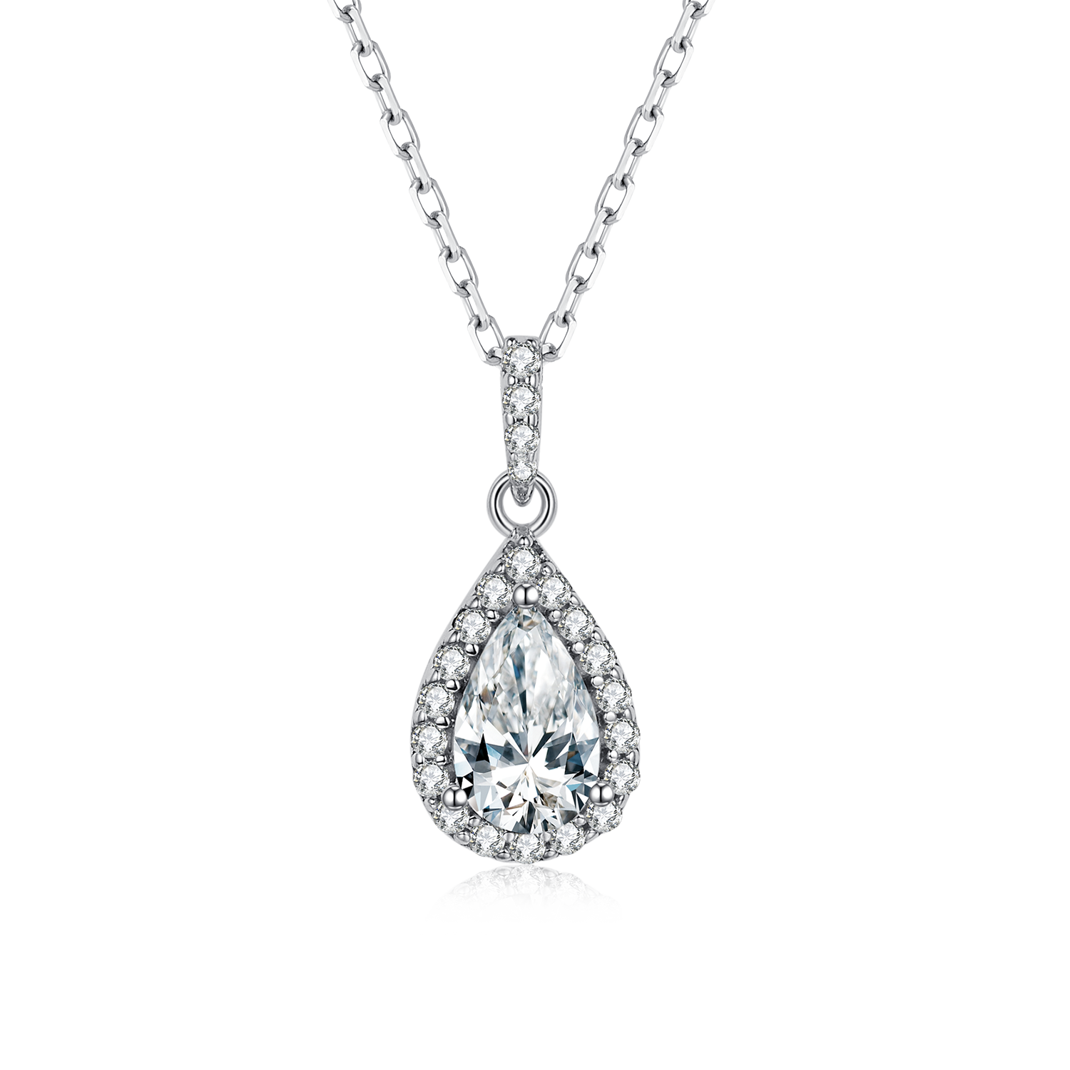 This exquisite necklace features a 1.0-carat pear drop Moissanite stone as its centerpiece. which is known for its brilliant sparkle and exceptional durability.