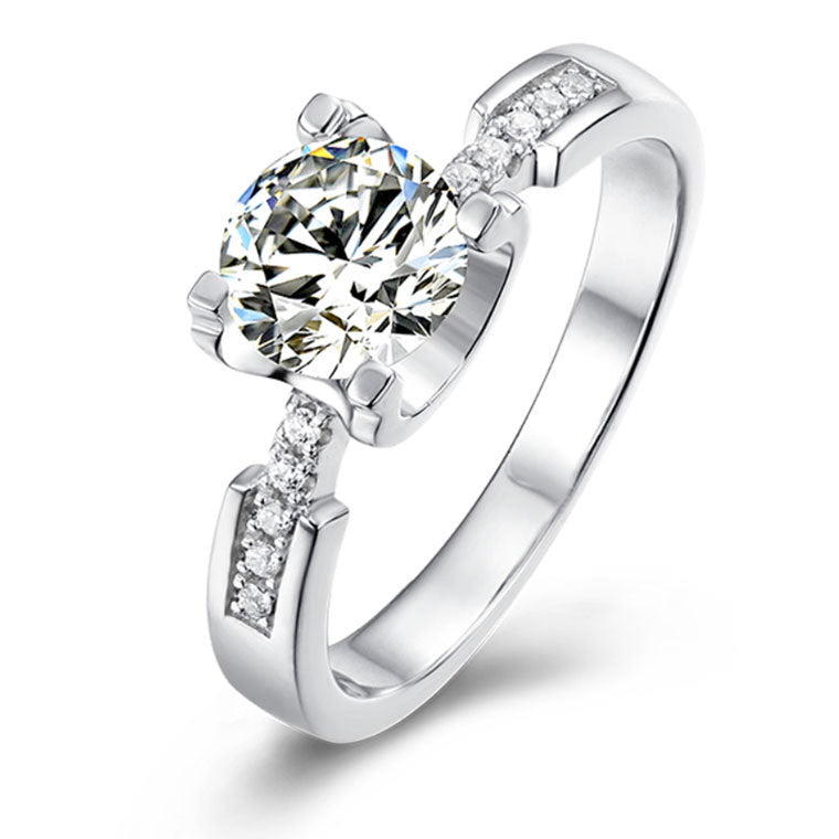 This charming and dainty ring is designed for women who appreciate the beauty of a delicate and fashion jewelry piece. It features a 1.0-carat round cut Moissanite stone. The oxhead four-prongs design makes the Moissanite more prominent.