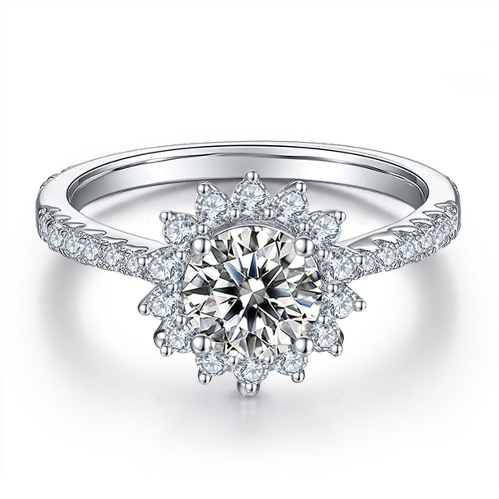 This ring uses a round cut 1.0-carat Moissanite stone. with high colour and purity. sparkly in any occasion. The unique lotou petal halo design with small Moissanite is the characteristic of this ring. making it more gorgeous and elegance.