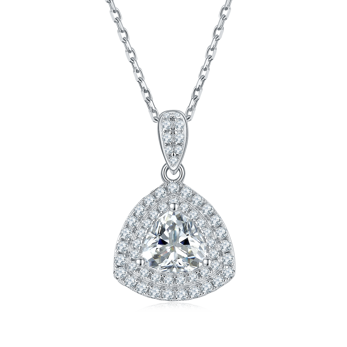 This luxurious necklace features a 1.0-carat unique triangle Moissanite stone as its centerpiece. which is known for its brilliant sparkle and exceptional durability.