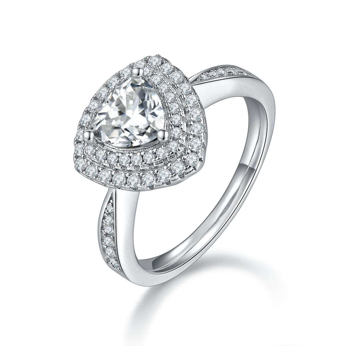 This luxurious and eye-catching ring is designed for women who desire a bold and sophisticated piece of jewelry. It features 1.0 carat Triangle Moissanite stone. Multiple small Moissanite are inlaid on the ring and the unique double halo design making the entire ring more luxurious and sparkly.