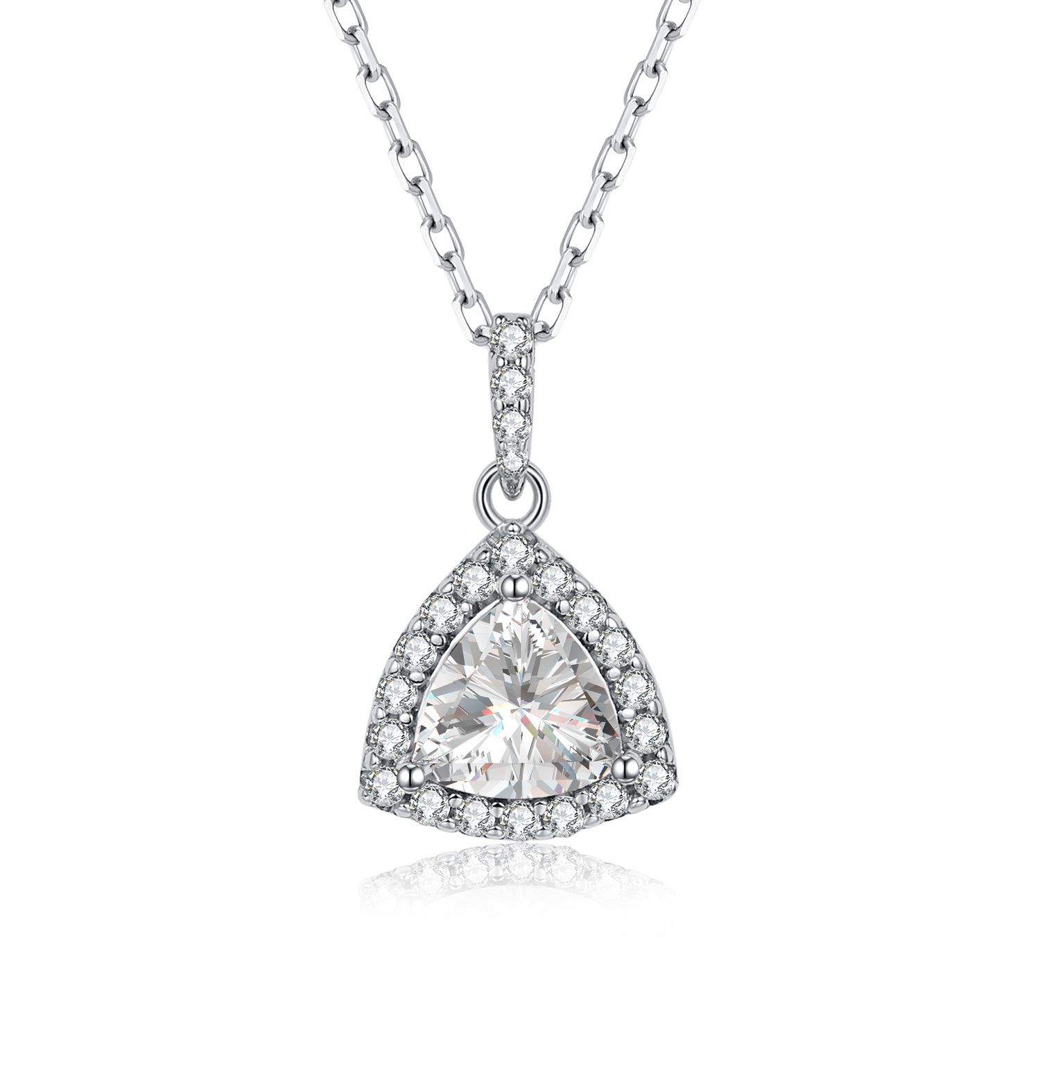 This exquisite necklace features a 1.0-carat unique triangle Moissanite stone as its centerpiece. which is known for its brilliant sparkle and exceptional durability.