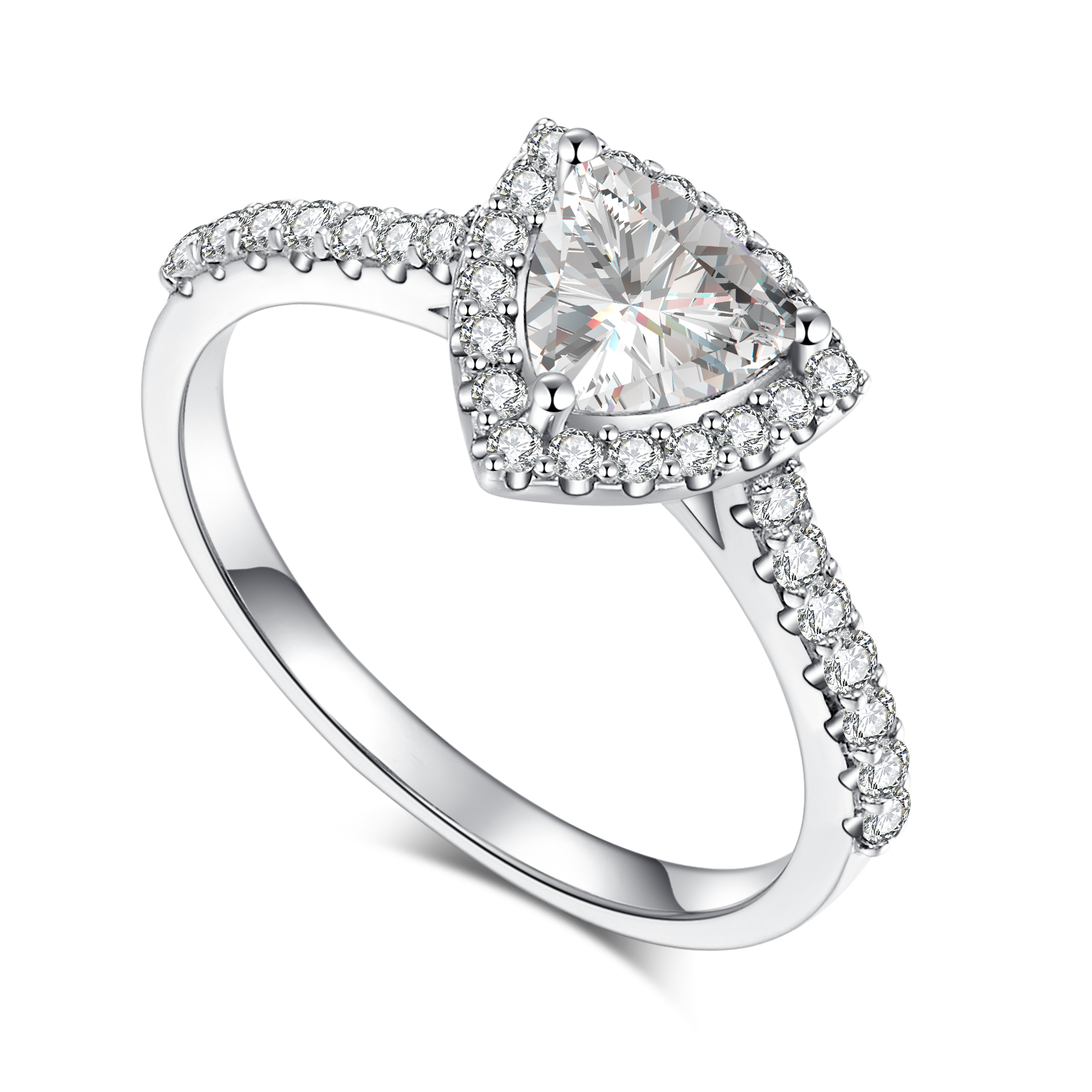 This ring uses a 1.0-carat Moissanite . with high colour and purity. allowing to shine in any occasion. At the same time. unique triangle shape and halo design are also one of the characteristics of this ring. making it more gorgeous and fashion. It is not only exquisite in appearance but also of high quality. making your loved one more comfortable when wearing it.