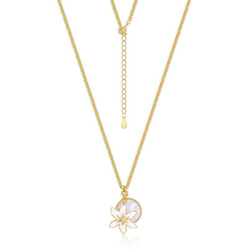 This elegant necklace features a delicate pendant combined of white daffodil with a round mother of pearl. all set in sterling silver plated in gold. The intricate design and choice of quality materials make this necklace a timeless and sophisticated addition to any outfit. Enjoy the beauty and versatility of this stunning piece.