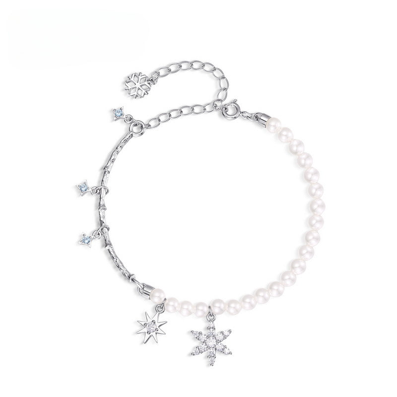 Offering a shimmering radiance. this Zircon Snowflake Shell Bead Chain Sterling Silver Bracelet is sure to catch the eye. This exclusive bracelet is crafted with half sterling silver chain and half pearl chain. as well as decorate with Zircon snowflake adding a touch of sophistication and luxury. Perfect for any special occasion.