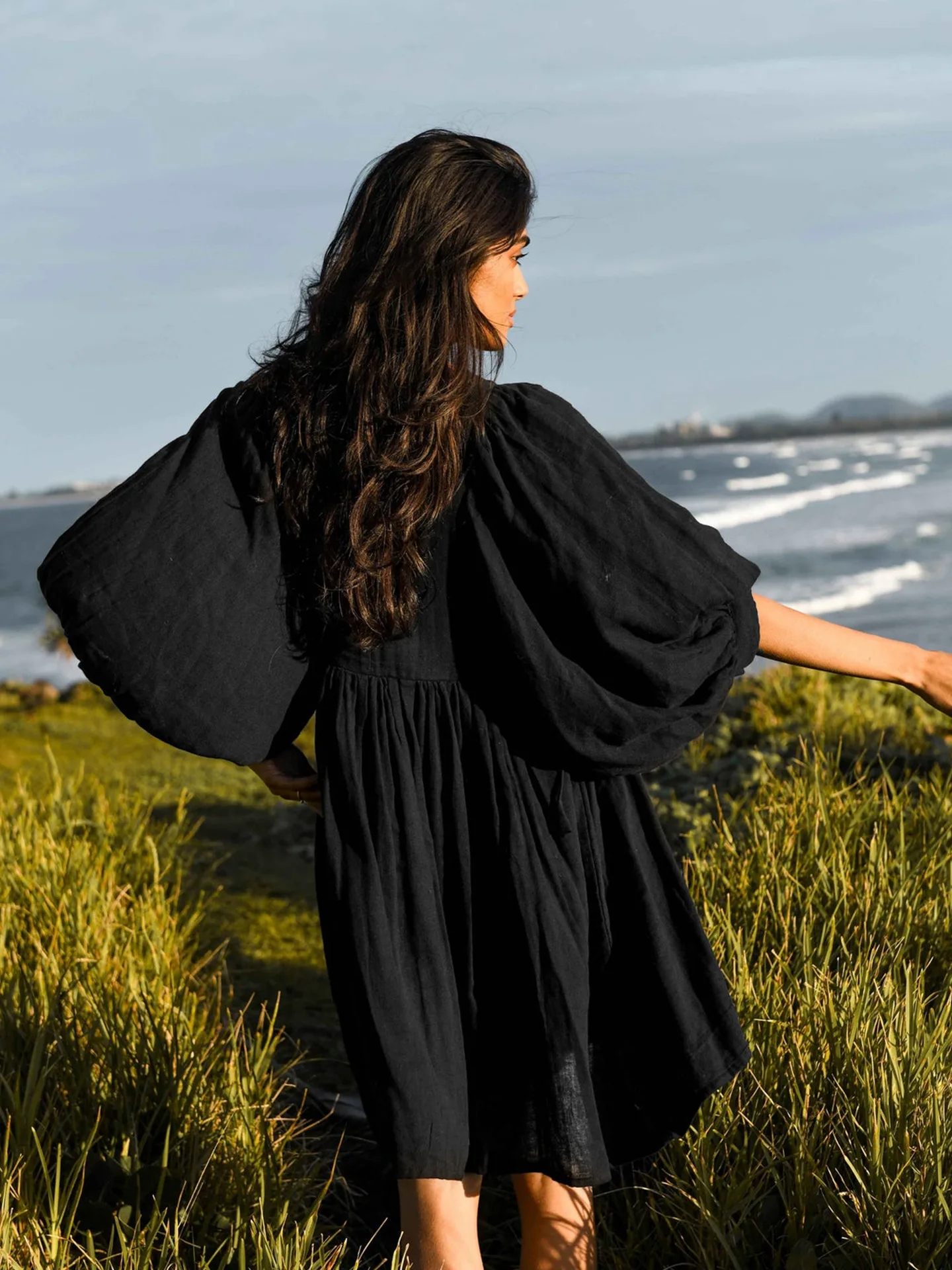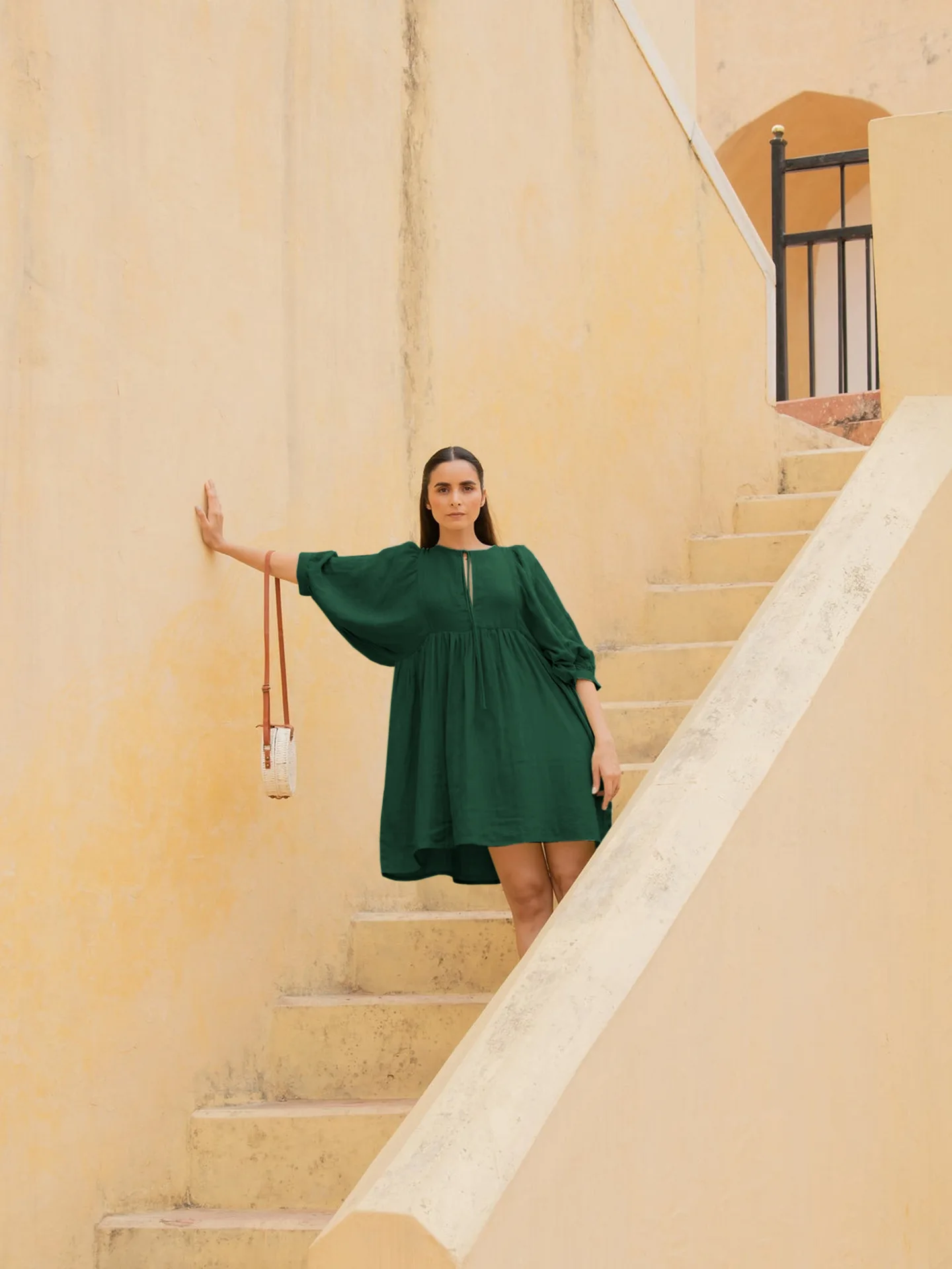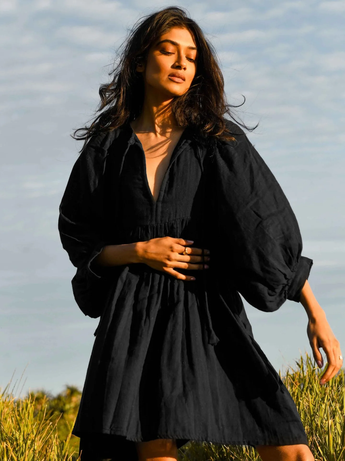2023 New Oversized Spring Dress Round Neck Lace Up Bat Sleeve Fashion Beach Mini Dress Pleated Large Size Vintage Boho Dress