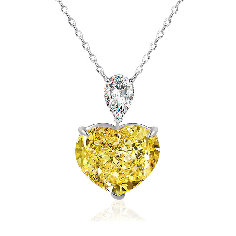 This memorable and elegant necklace features a stunning 5.0 Carat 13*13mm yellow Zircon in a heart shape pendant decorated with a small water droplet zircon. Crafted from sterling sliver. this pendant necklace is sure to add a touch of luxury to any stylish look.