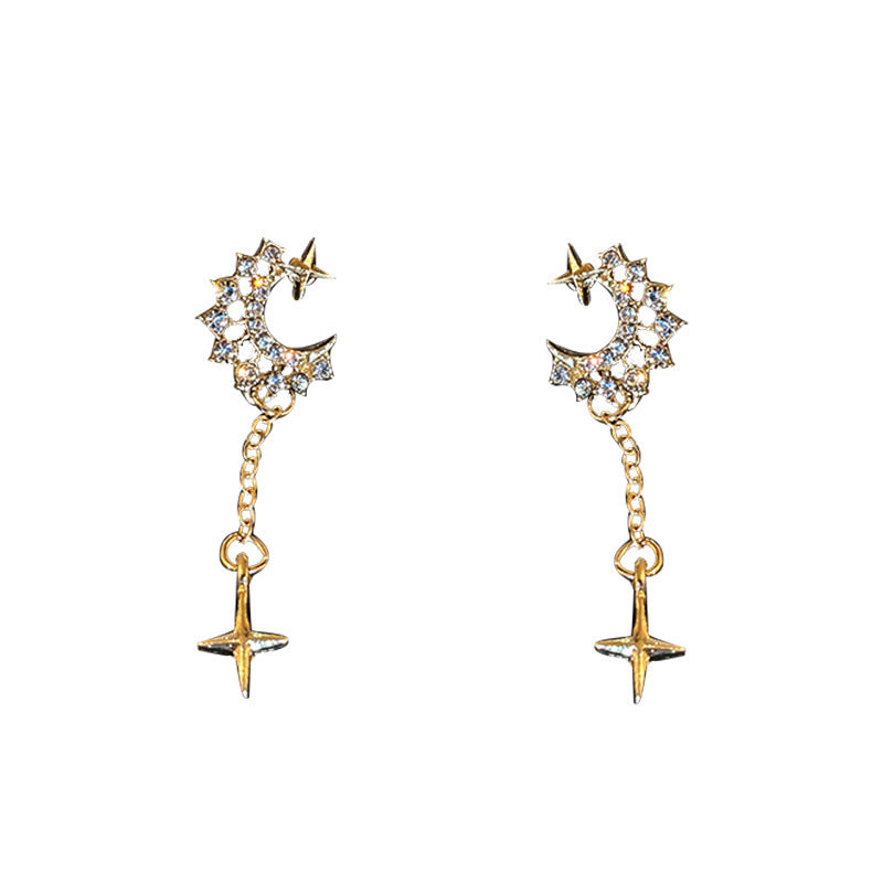 This chic silver drop earrings feature a four-pointed star with Zircon moon tassel for a unique. eye-catching look. The tassel with cross star adds to the intricate detail design and brings out the subtle sparkle. Perfect for any special occasion.