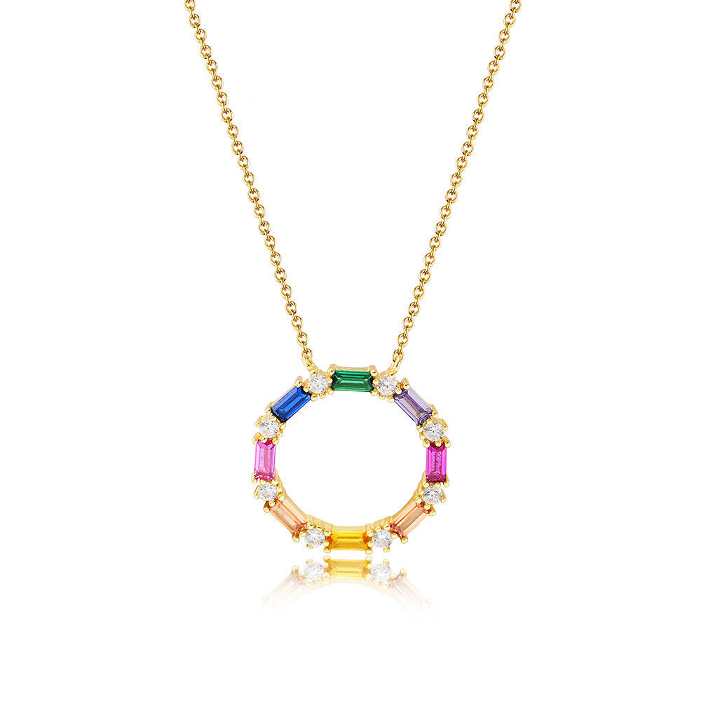 This Colourful Rectangle Zircon Ring Pendant Silver Necklace is a stunning piece for stylish women. The hollow circle pendant stands out with a colourful Rectangle Zircon that adds a touch of glamour to any outfit. Upgrade your jewellery collection with this exquisite necklace.