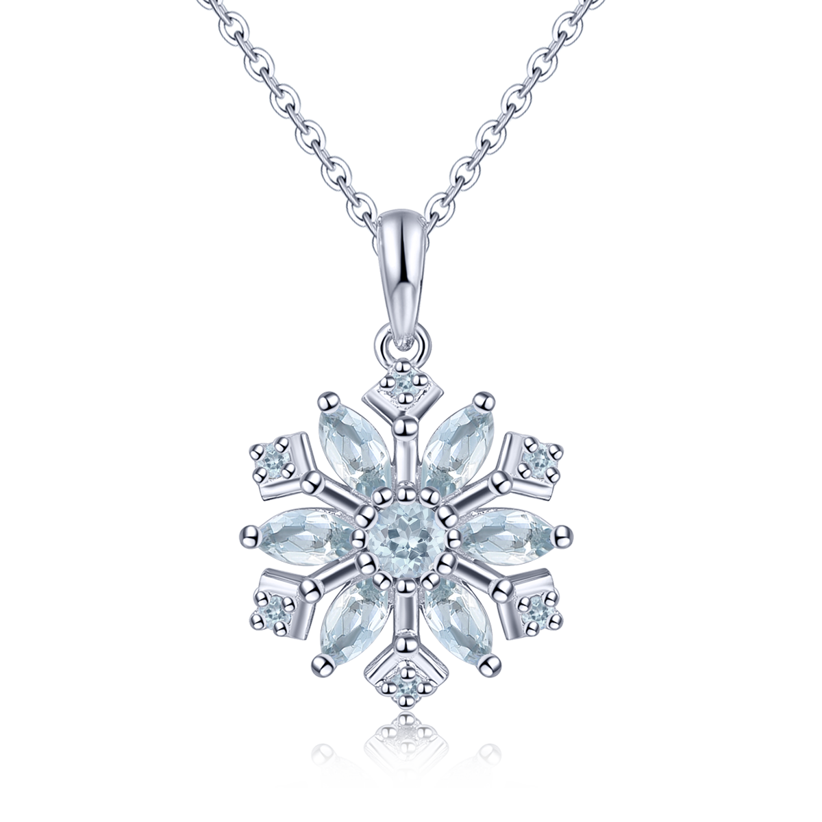 A stunning snowflake pendant composed with beautiful Aquamarine Stone make this necklace a perfect accessory for any woman's wardrobe. Crafted with precision. this necklace is sure to add a touch of shine to any ensemble.