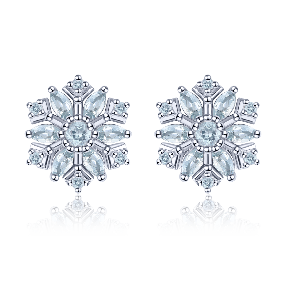 This earrings is an exquisite artwork. inspired by the winter snowflakes. symbolizing purity and beauty. The earrings are inlaid with aquamarine stone. with a colour resembling the mystery of the sea. emitting a charming luster.