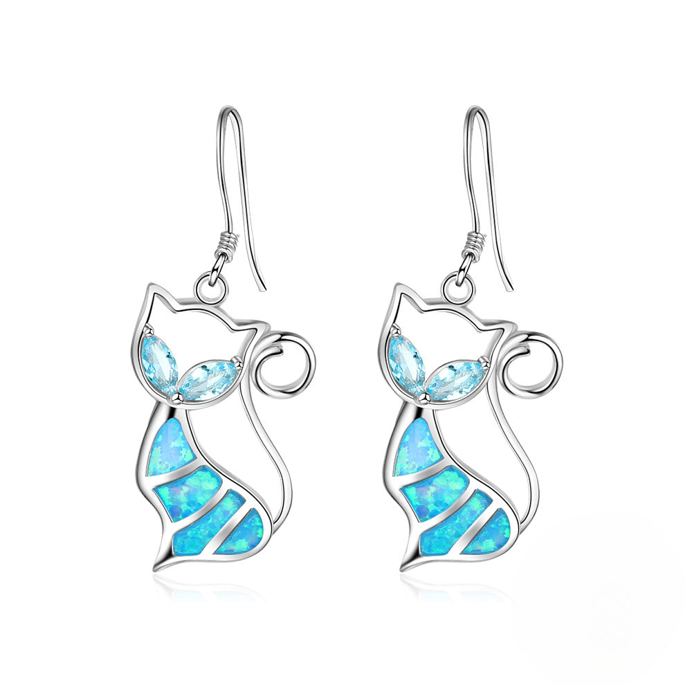 Adorn yourself with these exquisite sterling silver drop earrings featuring a cute cat pendant. inlaid with beautiful blue opal and decorate with graceful marquise-shaped blue zircon as eyes. These earrings exude sophistication and luxury. perfect for any occasion. Show off your style and create an eye-catching look with this elegant piece of craftsmanship. It's the perfect way to accessorize any ensemble.