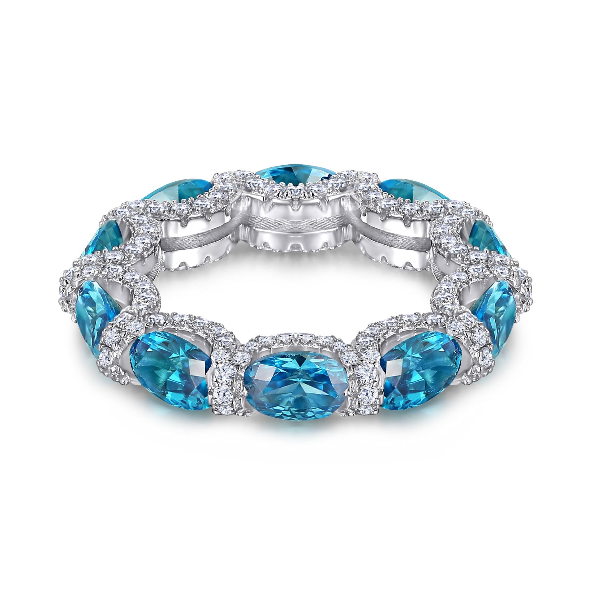 This Full Circle Ice Cut Oval Blue Zircon Silver Ring for Women is crafted with stunning oval blue zircon stones with Soleste halo of classic brilliance. Featuring an elegantly designed compose with oval blue zircons of full circle setting. this precious ring is sure to add sparkle and sophistication to any look.