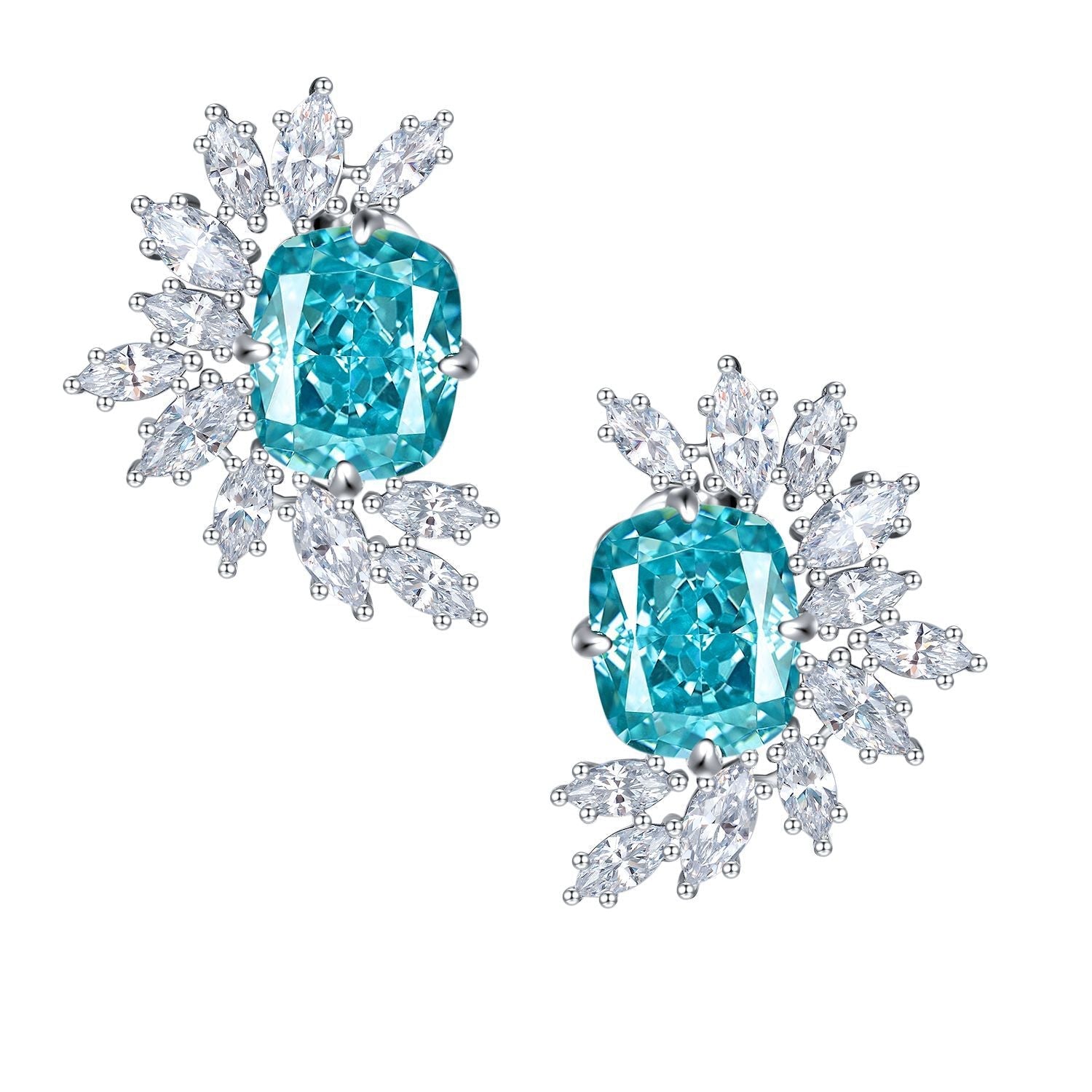 This studs earring features blue rectangular zircon as the main character. symbolizing stability and nobility. The design of the earrings is simple. with a half annular of horse eye shaped white zircon petals surrounding the zircon. resembling a half blooming flower. adding elegance and sweetness.