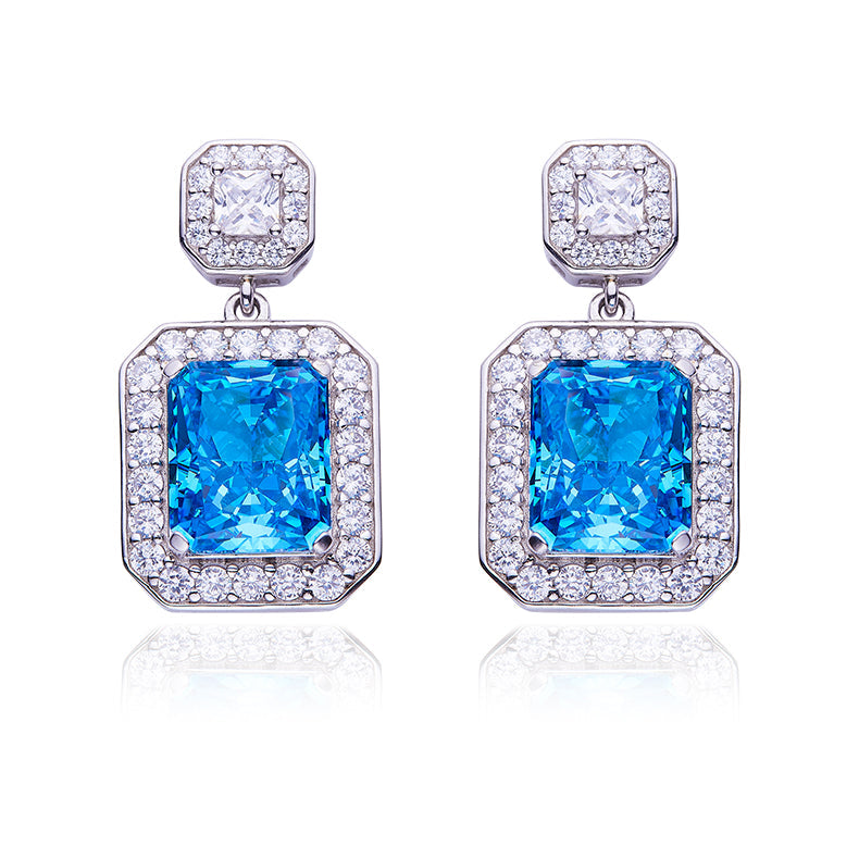 This drop earring is an impressive accessory suitable for women who enjoy dazzling and showy looks. Its design is a stunning 13.5-carat blue rectangular zircon as the main stone. surrounded by white zircon decorations. creating a halo effect that is very eye-catching and beautiful. Blue zircon represents confidence and courage. while white zircon represents innocence and peace.