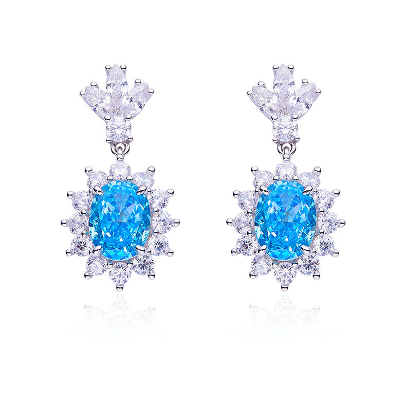 This drop earring is inspired by the dazzling fireworks. The earrings are made of pure silver material. embedded with a 3.2-carat blue oval shaped zircon as the main stone. surrounded by white round cut zircons as a halo. forming a beautiful flower pattern that emits brilliant sparks. like fireworks in the night sky. Blue zircon represents wisdom and loyalty. while white zircon represents innocence and peace.