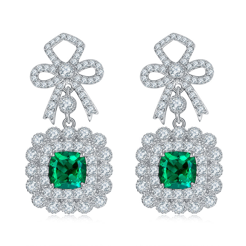 Enhance your style with the Bowknot Luxury Halo 12.7 Carat Square Lab Created Emerald Drop Earrings. Featuring a bowknot design. these chic earrings boast a 12.7 Carat Square Lab Created Emerald ringed by a double Halo of high-end glamour. An accessory that exudes sophistication and beauty.