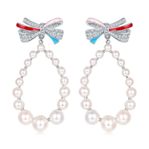 The upper part of the earrings is a delicate bow. embedded with shiny zircon and colourful enamel. full of layering and three-dimensional feeling. The lower part of the earrings is a circle made of pearls. emitting an elegant and gentle luster. A bow is a symbol of women. love. and happiness. as well as a symbol of happiness and freedom.
