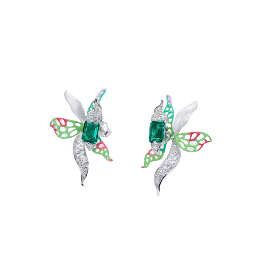 This studs earring is a combination of elegance and fashion. It is made of pure silver. and the material of the earrings is sturdy and durable. not easy to change color. Earrings feature a butterfly orchid. depicted in bright colour using enamel technology. with a lifelike shape. like a beautiful butterfly lingering in your ear. The earrings are also adorned with a green zircon. symbolizing the vitality and hope of nature.