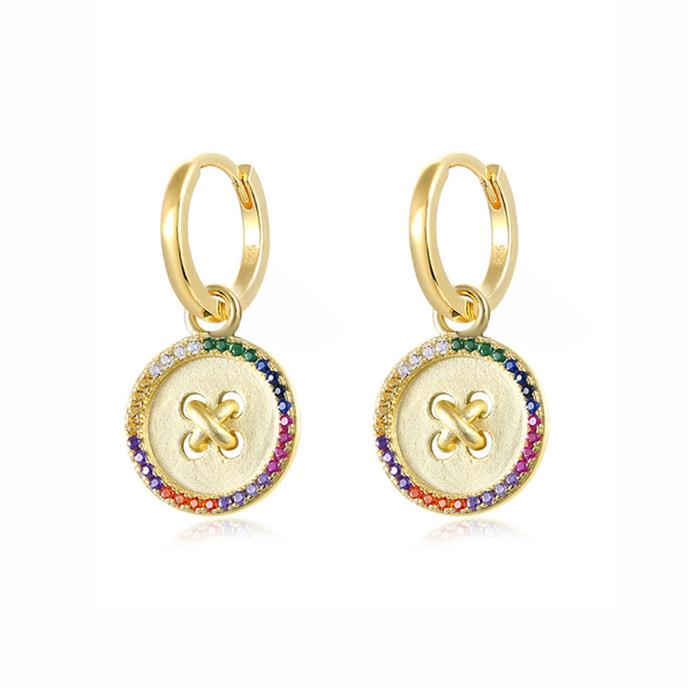 This drop earring features a unique round button pendant. symbolizing completeness and harmony. On the earrings. there is a circle of colourful small zircons surrounding the edge of the button. shining with a colorful glow. symbolizing colour and happiness.