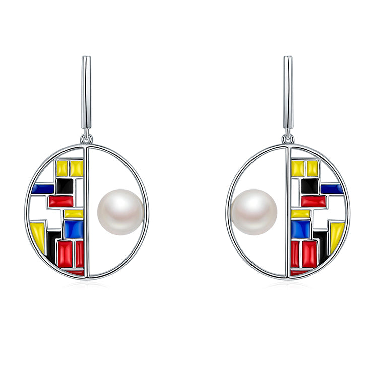 Enliven your look with this unique drop earrings! Featuring a striking circle pendant in a modern geometric pattern of colourful Mondrian enamel with pearls. this earrings make an elegant and sophisticated statement. Ideal for special occasions or everyday luxury.
