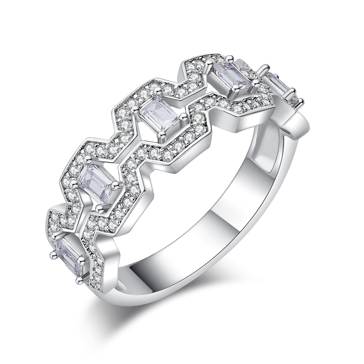 This luxurious and eye-catching ring is designed for women who desire a bold and sophisticated piece of jewelry. The concave & convex design with Emerald Cut Moissanite and multiple small stones is the characteristics of this ring that make this ring more gorgeous.