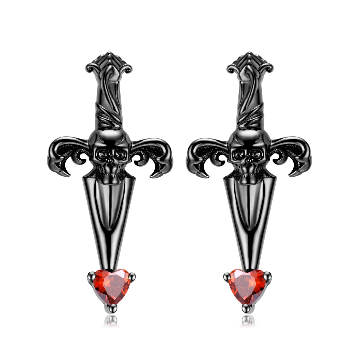 These black stud earrings feature a black skull cross sword thrust a heart shape red zircon . adding unique to halloween. The high-quality sterling silver construction ensures durability and long-lasting wear. Perfect for spooky Halloween parties or any other special occasion.