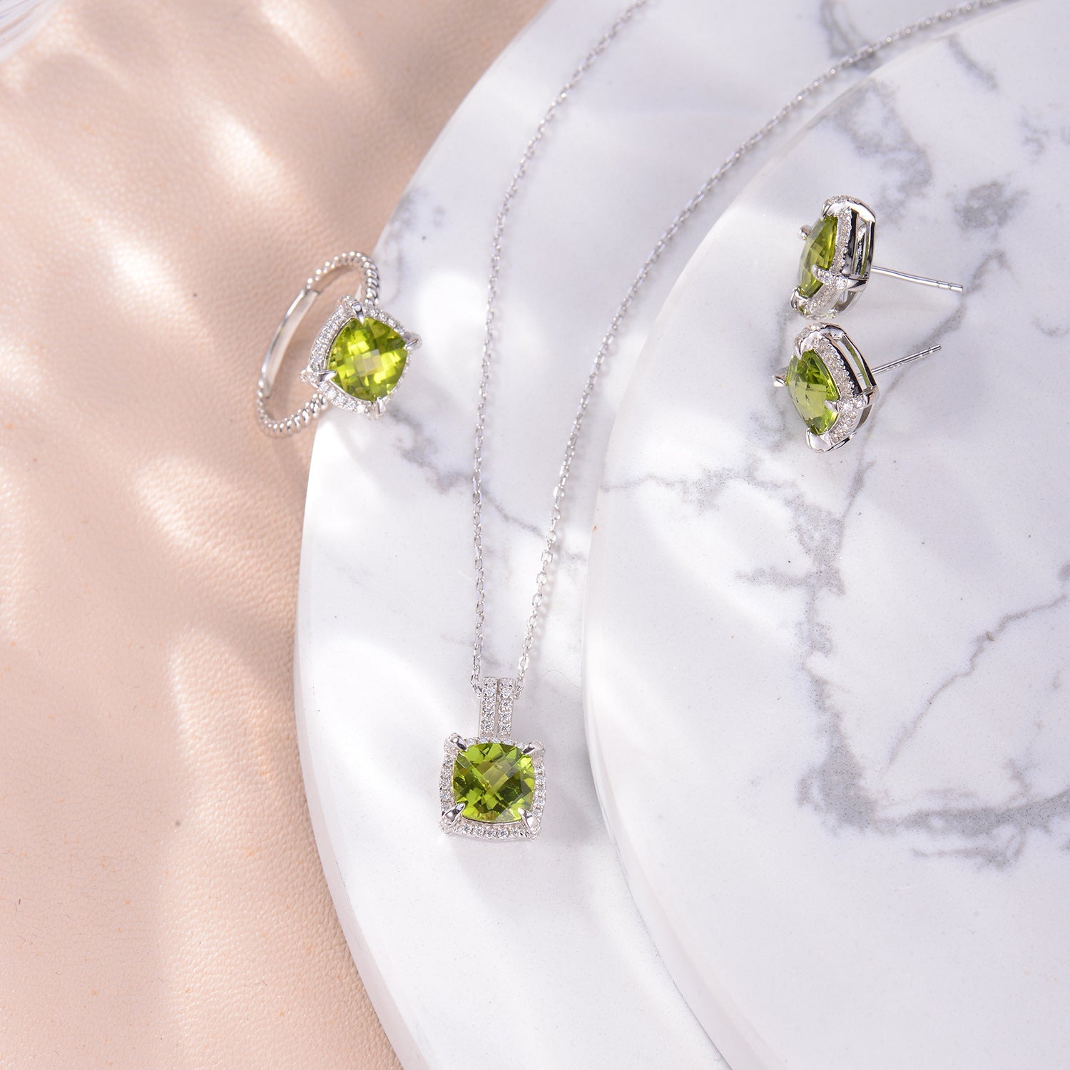 This Soleste Halo Square Natural Olivine Silver Ring will bring a touch of sophistication to any wardrobe. Crafted with a square-cut natural olivine. this unique piece is set against a gleaming sterling silver base. Its exquisite design will add an eye-catching sparkle to any ensemble.