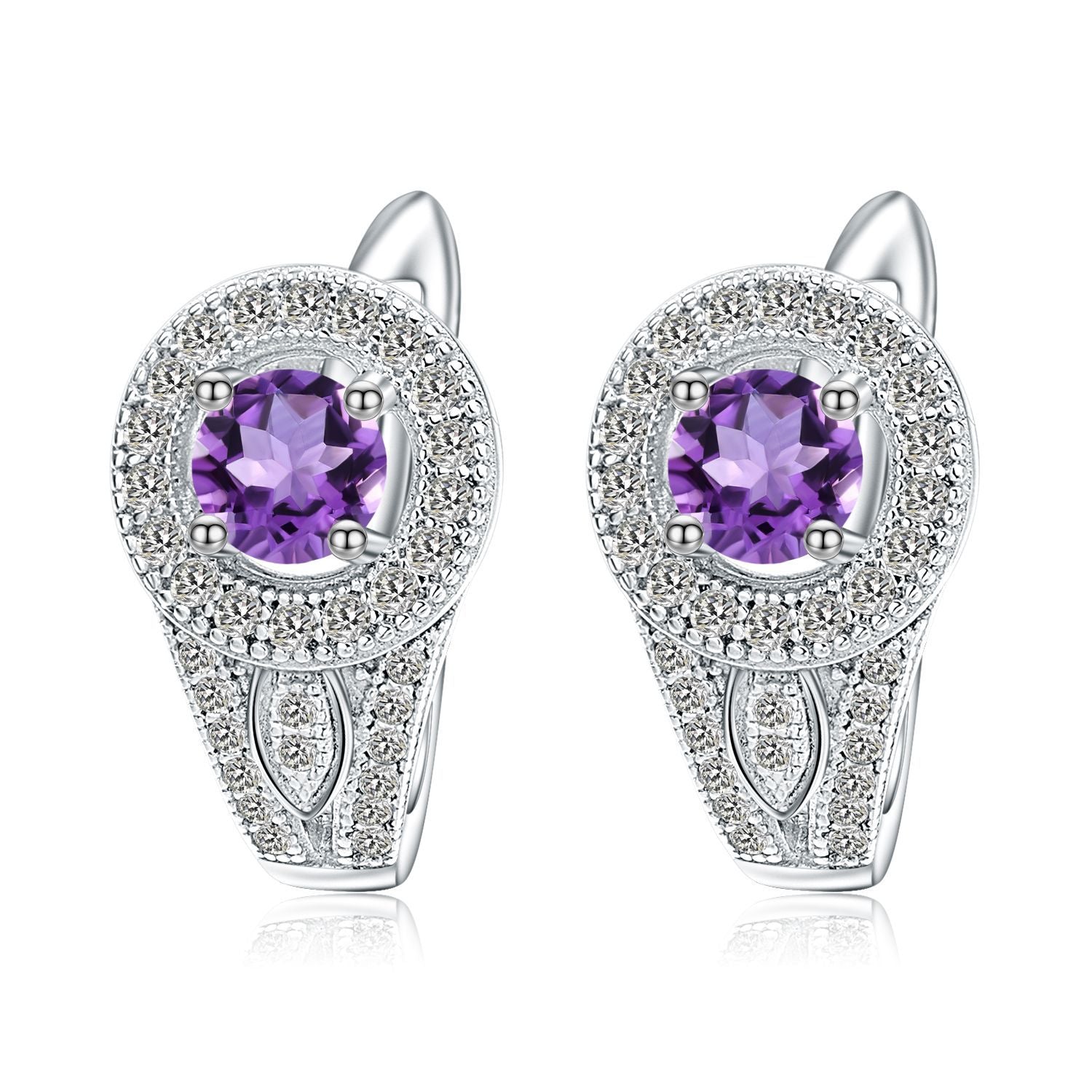 Luxuriate in European style elegance with this Soleste halo round cut natural amethyst earrings. Crafted from sterling silver. this studs feature an elegant amethyst setting in luxury glittering halo. Indulge in this timeless studs earrings. perfect for any woman.