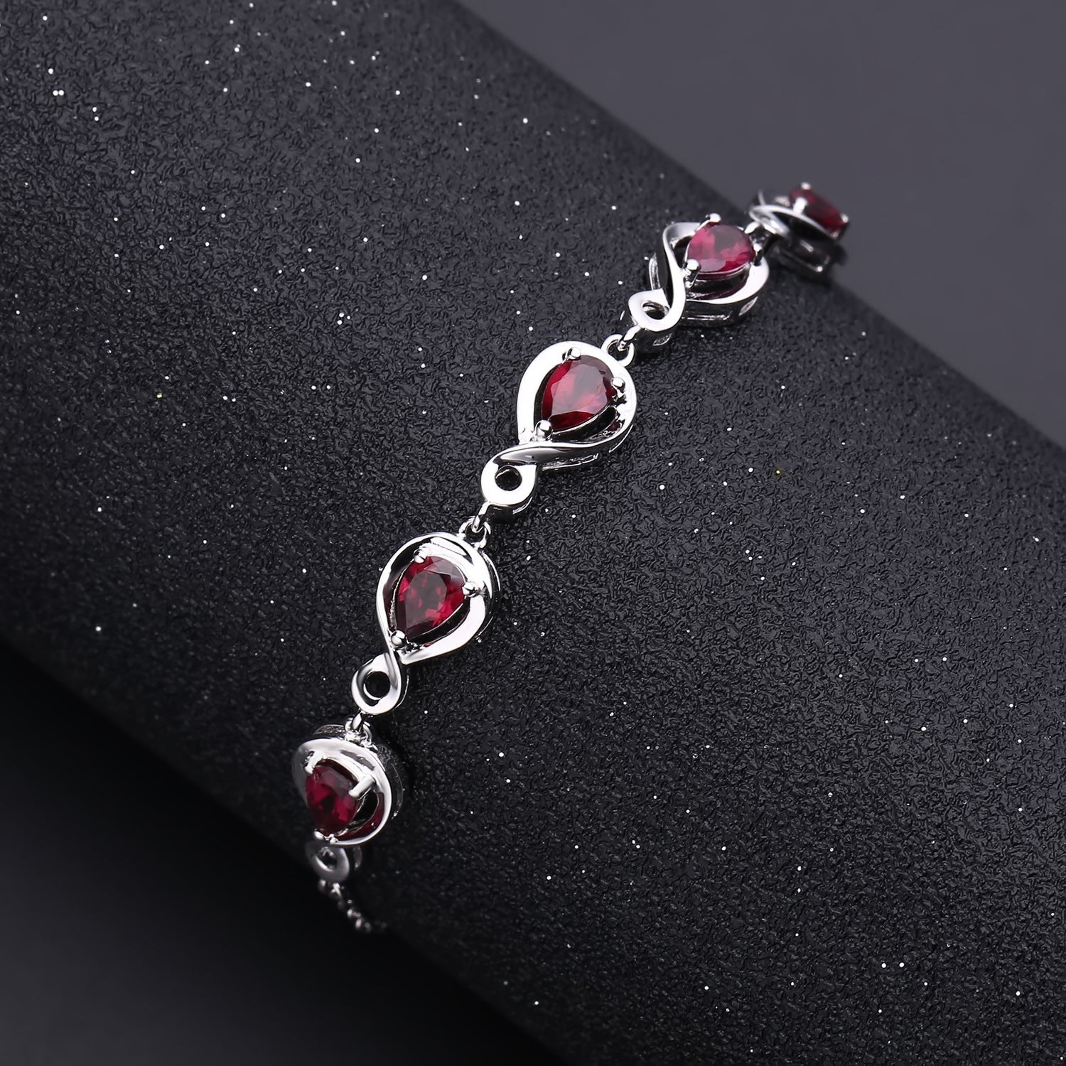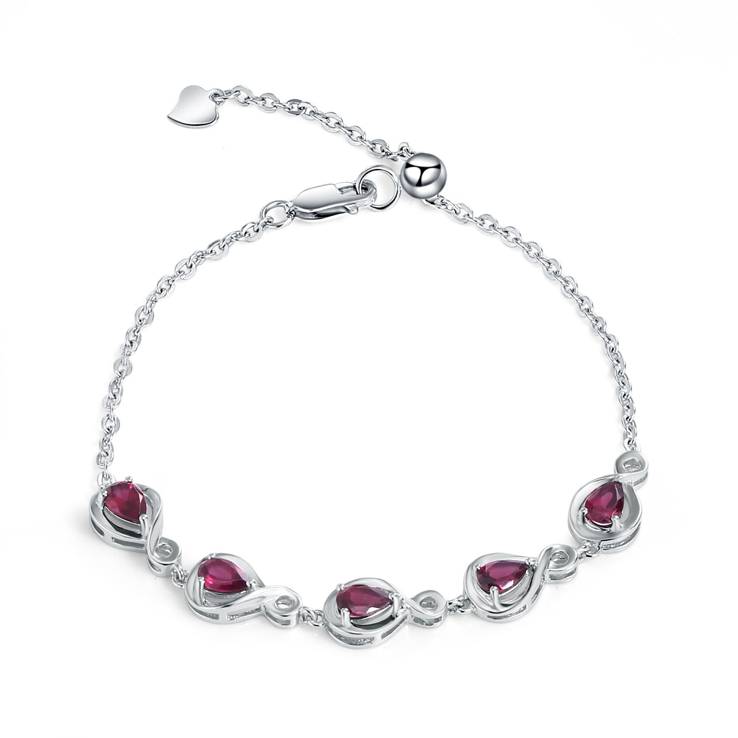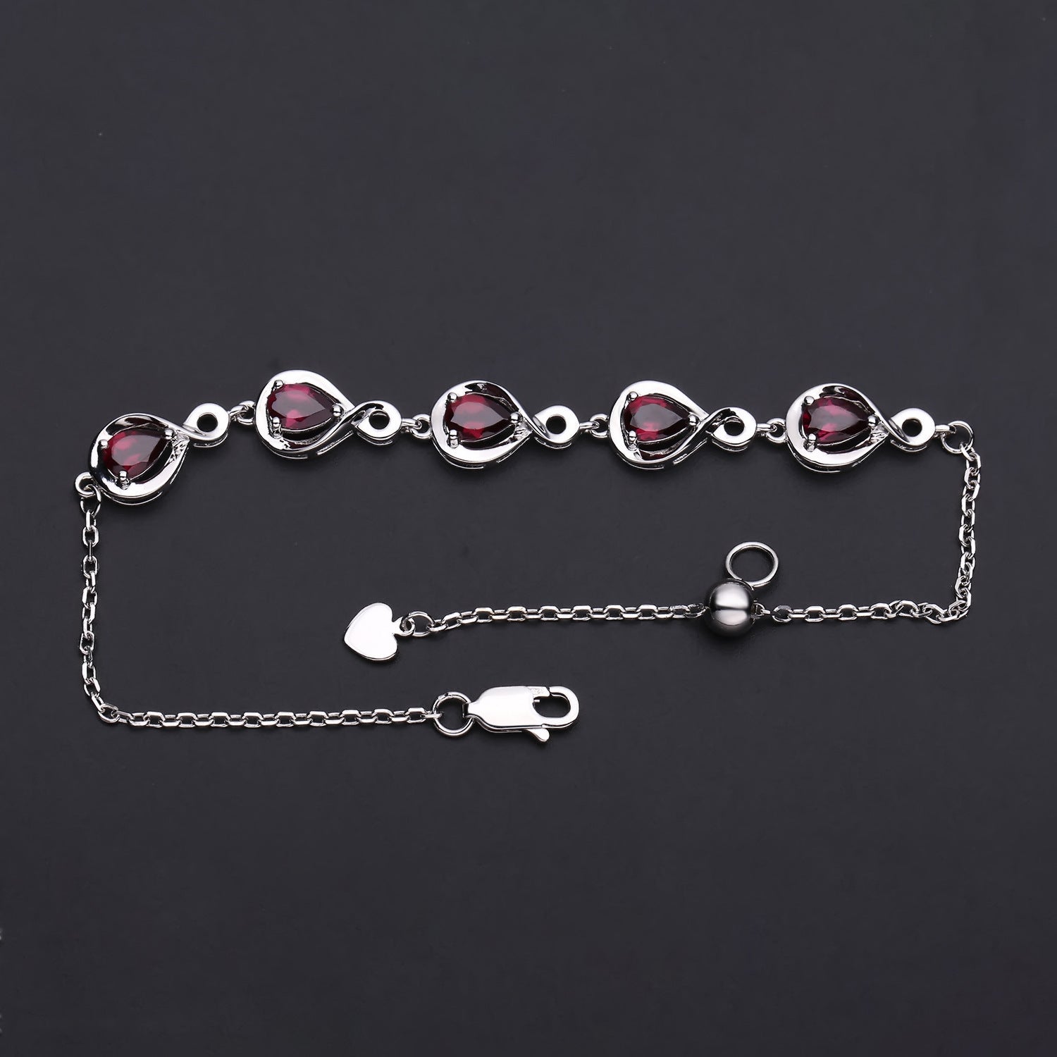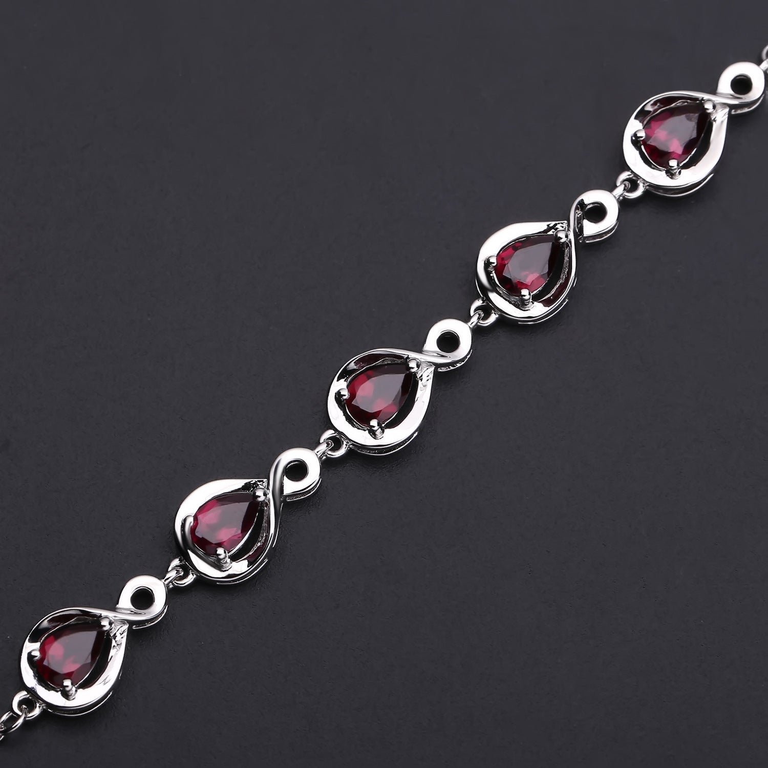 Meticulously crafted for a stunning look. this Pear Shape Rose Pomegranate Silver Bracelet adorns your wrist with five Pear Shape Rose Pomegranate stones for a brilliant and timeless piece. Perfect for any occasion. its elegant design will shine for years to come.