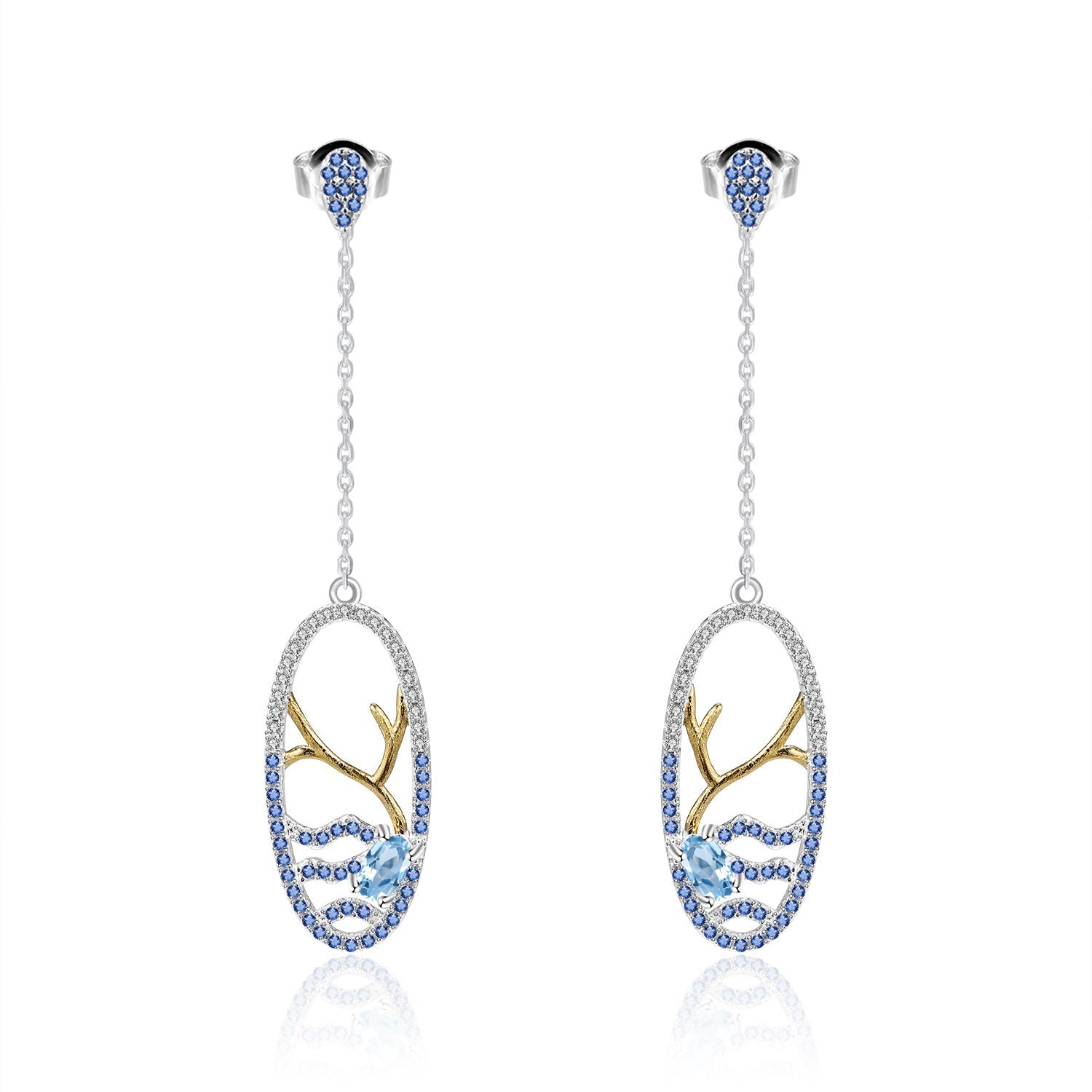 This stylish Natural Topaz Lake In Oval Long Design Silver Drop Earrings is designed to make a elegant statement. Crafted from Sterling Silver and featuring an elegant. hollow oval pendant adorned with a beautiful Lake pattern and glimmering Natural blue Topaz. this earrings provide a luxurious addition to any wardrobe.