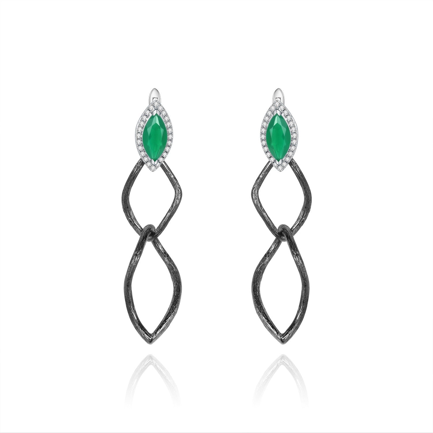 There are two hollowed out rhombus shapes below the horse eye stone. adding a sense of design and space. The earrings are made of pure silver and plated in black. creating a sharp contrast with the colour of gemstones. adding a sense of fashion and modernity.
