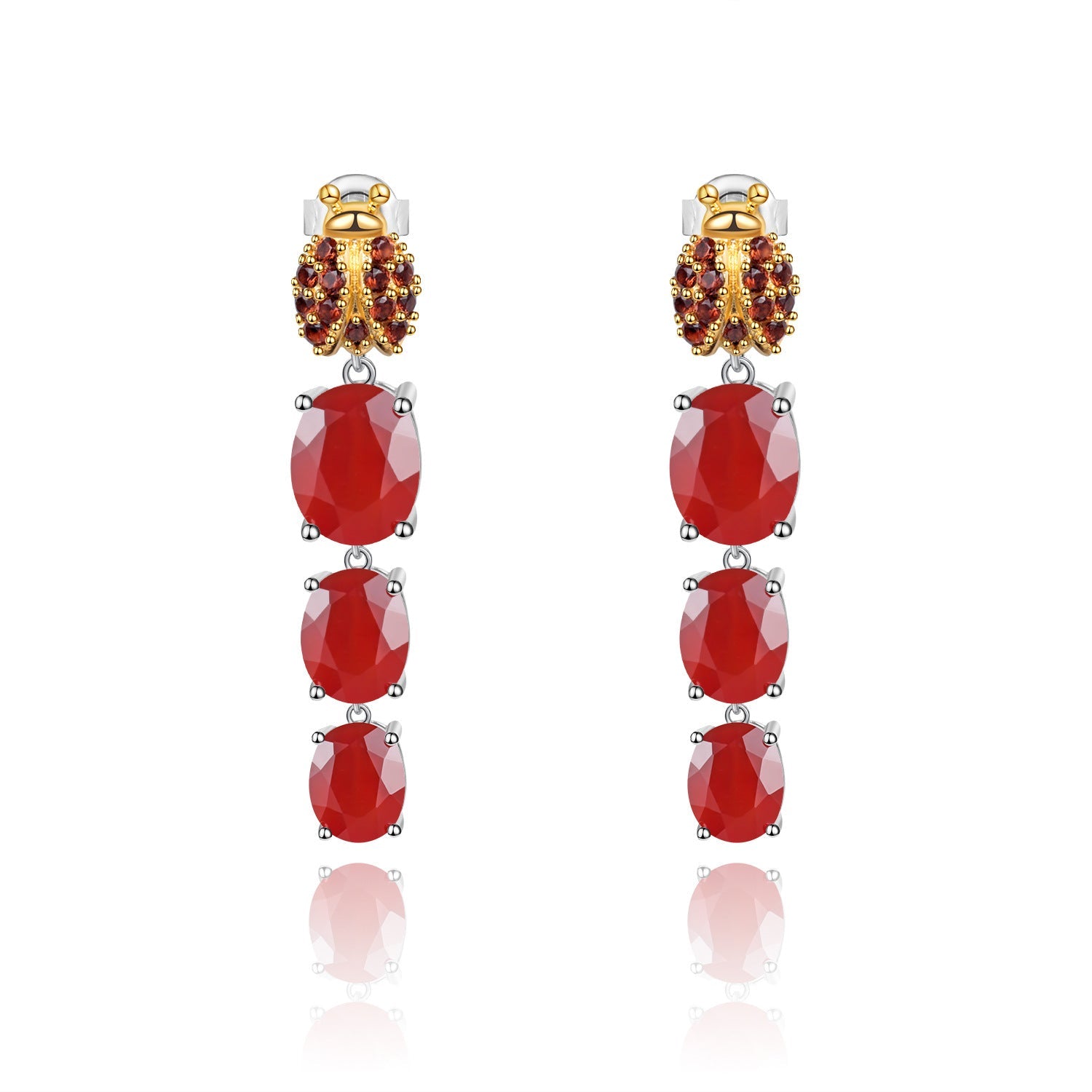 This drop earring features a seven star ladybug design. symbolizing a carefree and free life. Under the Seven Star Ladybug hangs three gemstones arranged in descending order. representing the past. present. and future. symbolizing beautiful memories and expectations.