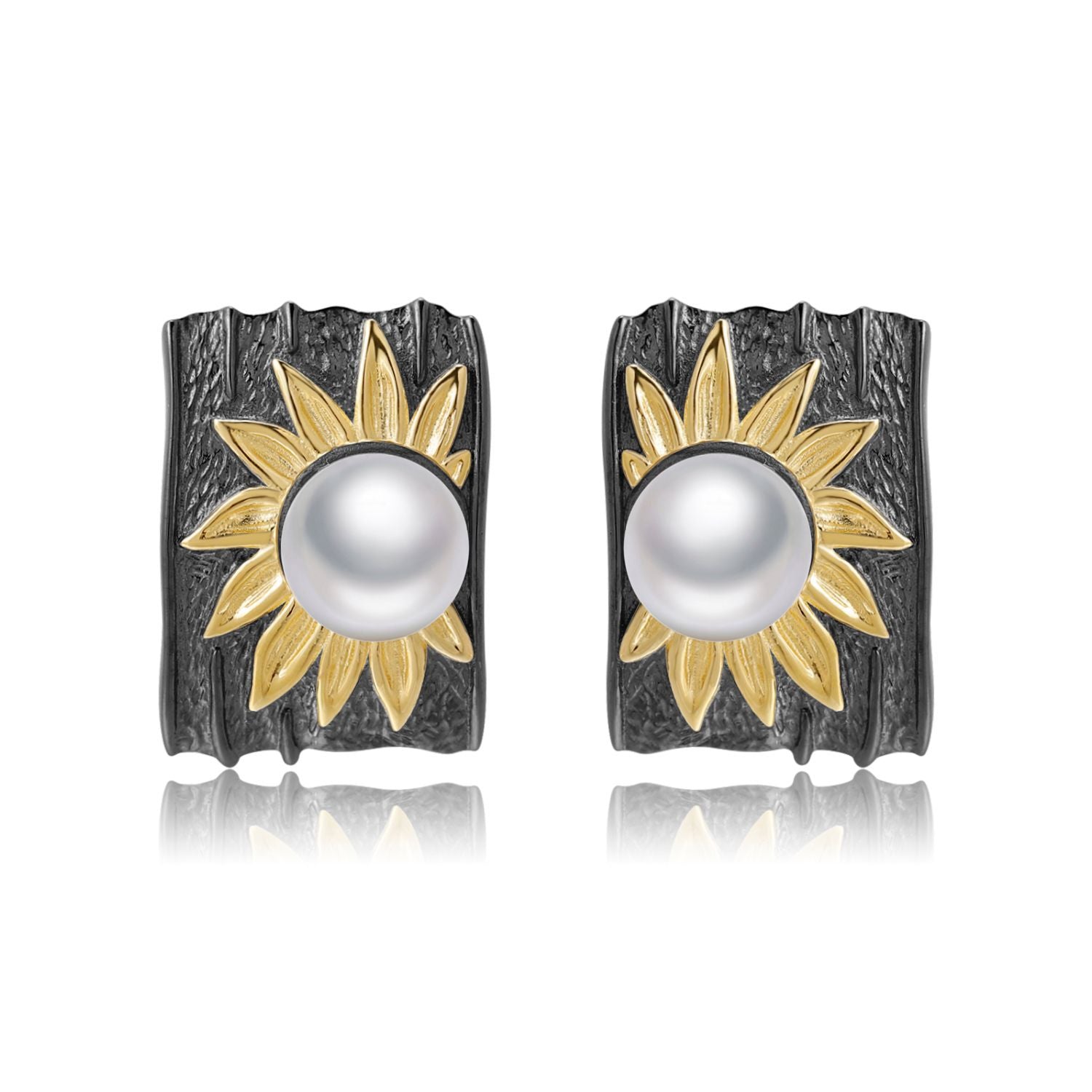 Add a touch of elegance to your look with this stunning rectangle-shaped earrings. featuring a sunflower-pattern with Freshwater Pearl. Crafted from sterling silver. this sophisticated pair of earrings is sure to draw attention.