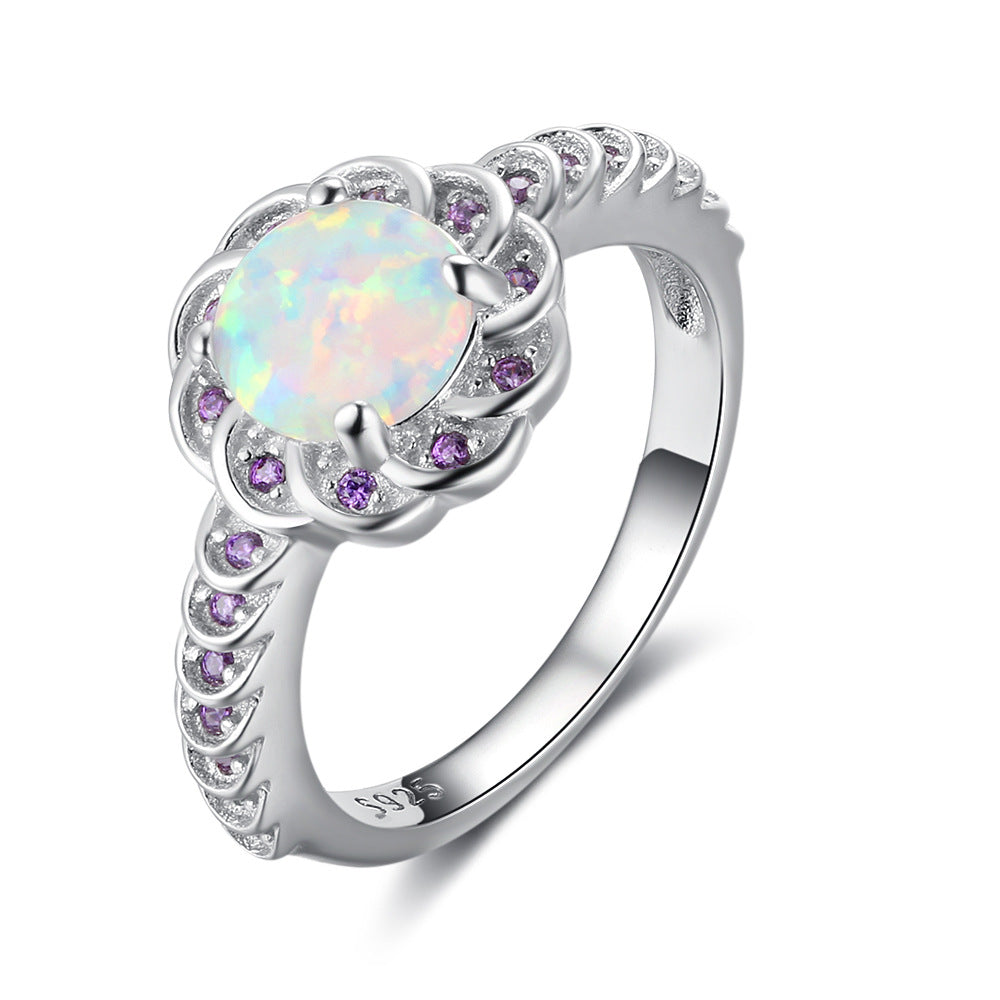 This Round Opal Flower Halo Zircon Sterling Silver Ring is crafted with utmost care and detail. with a round opal surrounded by a flower halo of sparkling zircons. Expertly designed for style and elegance. this ring exudes sophistication and glamour.