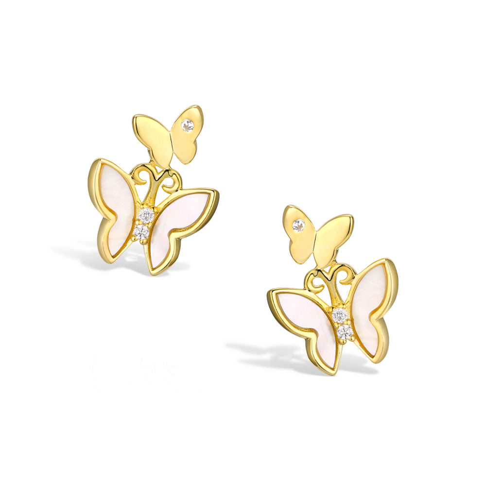 This delicate Double Butterfly studs feature classy Mother-of-pearl and sparkling Zircon stones. and made of sterling silver. A timeless classic. perfect for any special occasion.