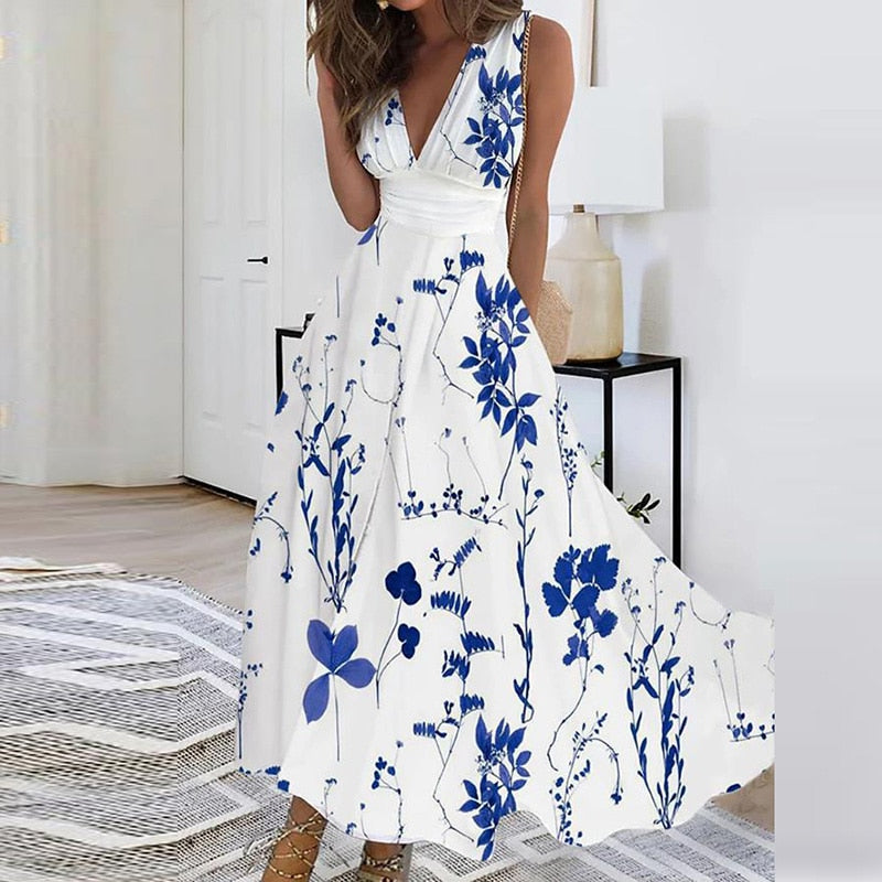 Elegant Pattern Print High Waist Party Dress Summer Deep V Neck Sleeveless Long Dress Female A-Line Big Hem Slim Evening Dresses