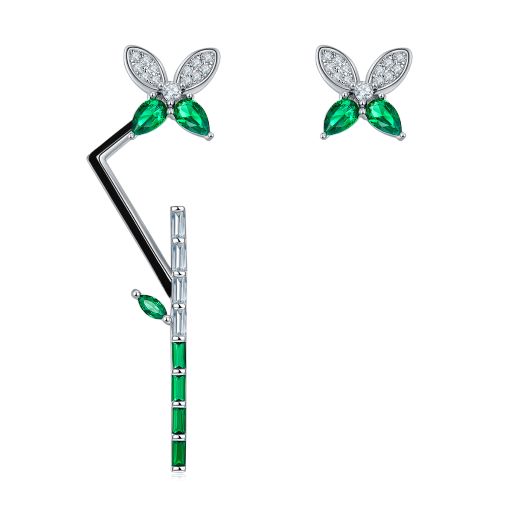 This earrings feature an asymmetric design made of sterling silver and enamel emerald coloured bamboo flower. They are perfect for any woman looking to add a unique yet classic touch to their ensemble. The durable construction ensures they will stand up to everyday wear.
