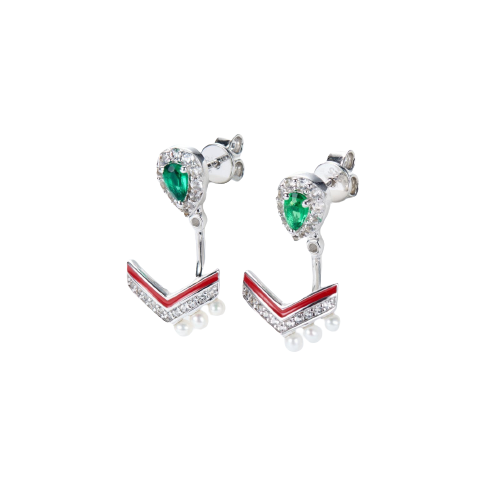 These Green Spinel and V Shape with Pearl Enamel Drop Earrings bring style and sophistication. Crafted from water drop Green Spinel and a V-Shape decorated with topaz and beautiful Pearl. and feature Enamel finish for a look that stands out but is still subtle enough to compliment any outfit.