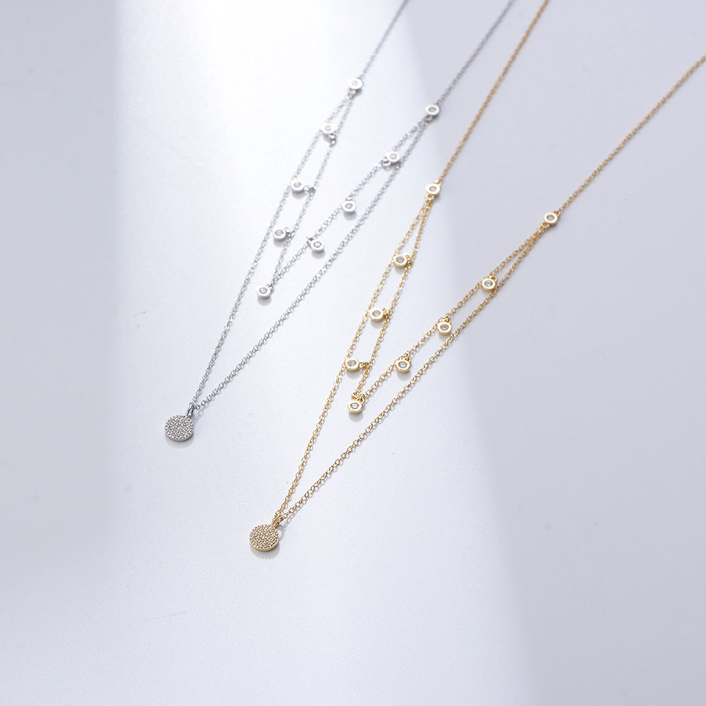 This stylish Round Point Zircon Sterling Silver Double-layer Necklace for Women features two layers of delicate design . decorate with small Round Zircon and a sparkling circle pendant with zircon. Crafted from sterling silver. it's the perfect addition to any look.