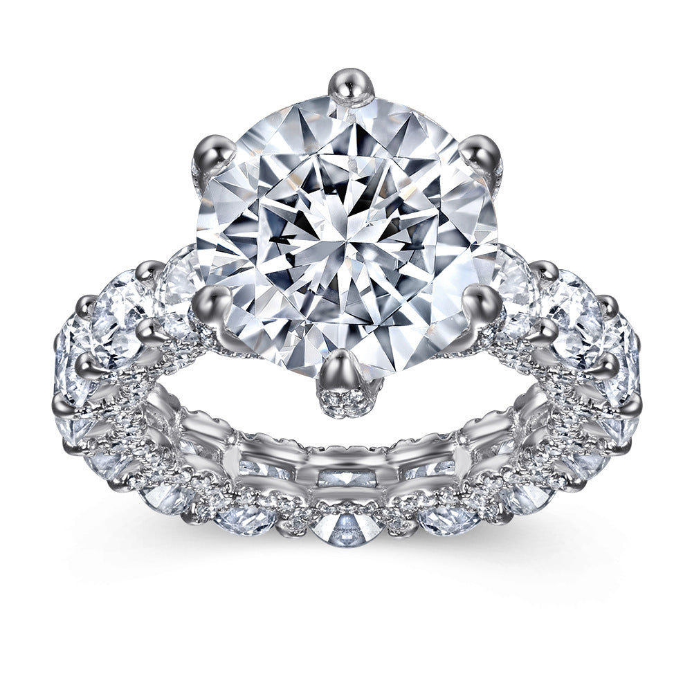 This Exaggerated Full Zircon with Six Prongs Round Zircon Silver Ring for Women is the perfect accessory for any outfit. Featuring six prongs holding a round zircon and an exaggerated ring band composed of small round zircons. this ring is sure to make any woman stand out.