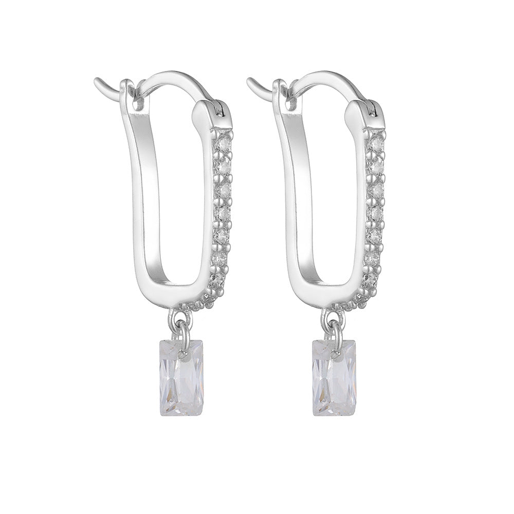 These stunning Radiant Cut Zircon Pendant U Shaped Sterling Silver Hoop Earrings exude luxury and elegance. Showcasing a delicately Radiant Cut zircons pendant and a sleek and sophisticated U-shape hoop design. these hoop earrings feature sophisticated craftsmanship and timeless chic. A classic piece for a truly radiant look.