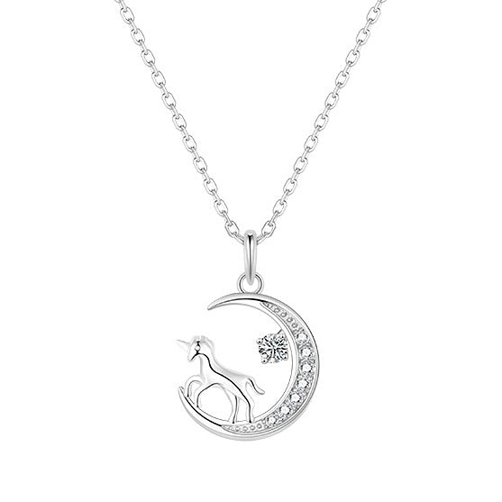 This sophisticated necklace features a delicate Zircon Moon pendant with an elegant exquisitely detailed Unicorn . perfect for adding a subtle touch of glamour to any outfit. The quality sterling silver craftsmanship ensures this piece is sure to stand the test of time.